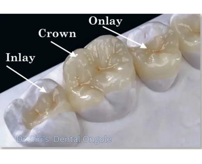 An inlay fits inside the tooth, an onlay covers one or more cusps, and a crown covers the entire tooth for maximum strength and protection.